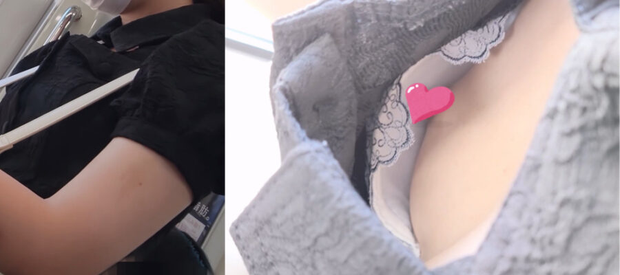 電車に乗って隣に立って胸元を見てみると、予想通り胸元が丸見えになっていました。